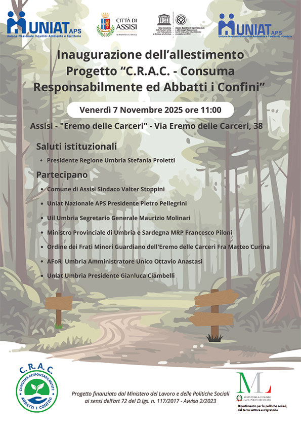 Assisi, 03/11/2025 – Verrà inaugurata il 7 novembre 2025 la nuova segnaletica accessibile del bosco dell’Eremo delle Carceri ad Assisi, realizzata da UNIAT Aps (Unione Nazionale Inquilini Ambiente e Territorio), nell’ambito del progetto “C.R.A.C. – Consuma Responsabilmente ed Abbatti i Confini”, finanziato dal Ministero del Lavoro e delle Politiche Sociali, sensi dell’art. 72 del D.lgs. n. 117/2017, avviso 2/2023.
