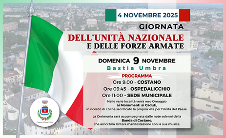 Bastia Umbra, 05/11/2025 – Il Comune di Bastia Umbra informa la cittadinanza che Domenica 9 novembre 2024 si terranno le celebrazioni per la Giornata dell’Unità Nazionale e delle Forze Armate, in occasione della ricorrenza del 4 novembre.