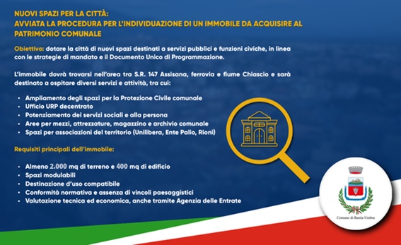 Come previsto dall’atto, l’Amministrazione intende reperire un immobile nell’area compresa tra la S.R. 147 Assisana, la linea ferroviaria e il fiume Chiascio, idoneo a ospitare diversi servizi comunali e funzioni civiche. Tra le destinazioni previste: