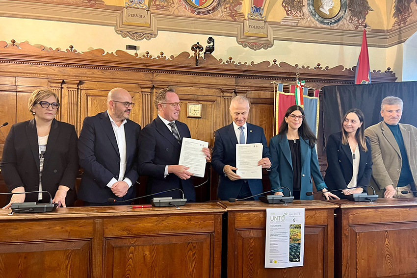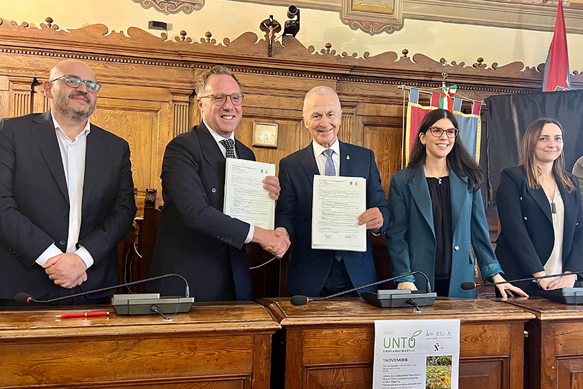 Assisi, 03/11/2025 – Promuovere l’olio extravergine di oliva come risorsa strategica per il turismo sostenibile, mettendo in rete comunità olivicole, esperienze e realtà culturali fra Umbria e Puglia, per azioni congiunte utili alla valorizzazione dei territori e del patrimonio immateriale legato all’ulivo come simbolo di pace. Questi gli obiettivi principali dell’accordo di partenariato siglato il 1° novembre 2025 dai Comuni di Assisi e Mattinata, che mette in rete UNTO e FèXtra, festival dedicati all’olio evo che si svolgono rispettivamente nelle due città. Il patto è stato sottoscritto dai sindaci Valter Stoppini e Michele Bisceglia, nella Sala del Consiglio della città serafica, presenti per Assisi anche la presidente del Consiglio comunale Annalisa Rossi, il vicesindaco con delega alla cultura Veronica Cavallucci e gli assessori Scilla Cavanna (agricoltura), Fabrizio Leggio (turismo), Donatella Casciarri (centro storico) e per Mattinata anche gli assessori Paolo Valente (vicesindaco con delega all’industria turistica) e Rosanna Ciuffreda (agricoltura).