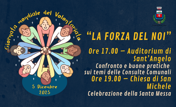 La giornata si articolerà in due momenti significativi: un incontro di confronto e scambio di buone pratiche all’Auditorium di Sant’Angelo, dedicato alle Consulte Comunali, e a seguire la celebrazione della Santa Messa presso la Chiesa di San Michele, come occasione di raccoglimento e riconoscenza verso chi opera al servizio degli altri.