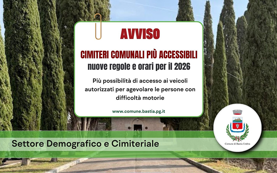 Bastia Umbra, 23/12/2025 – L’Amministrazione comunale di Bastia Umbra intende favorire e incrementare l’accesso ai cimiteri comunali da parte dei veicoli muniti di apposito permesso rilasciato dalla Polizia Locale, con particolare attenzione alle persone con difficoltà motorie.