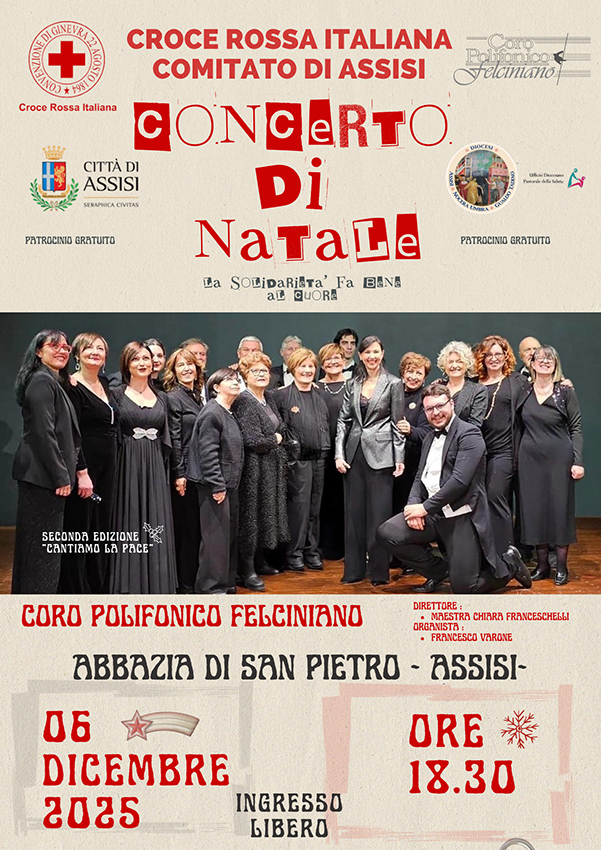 Assisi, 01/12/2025 – Il Comitato di Assisi della Croce Rossa Italiana è lieto di annunciare la seconda edizione del concerto di Natale “Cantiamo la Pace”, che si terrà sabato 6 dicembre alle ore 18.30 presso la suggestiva Abbazia di San Pietro in Assisi.