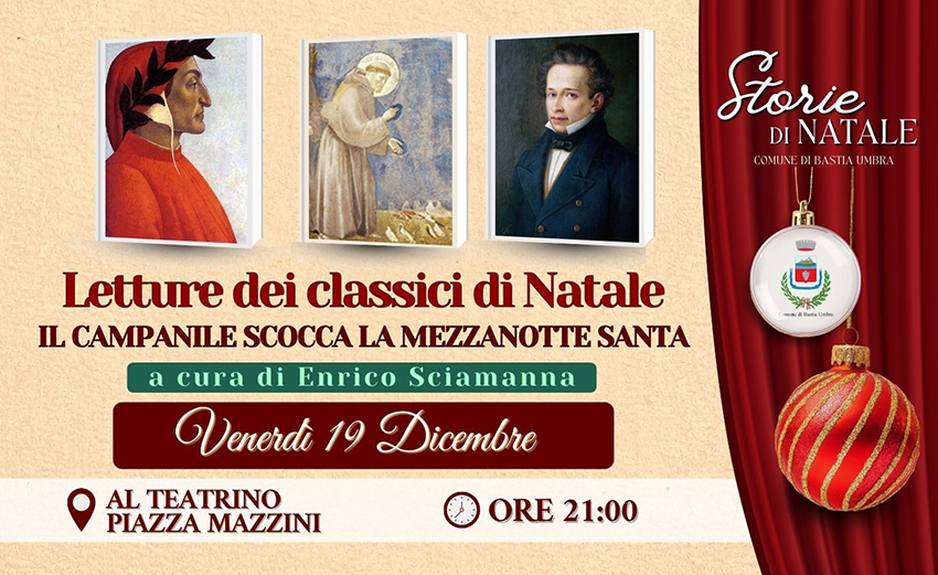 Bastia Umbra, 16/12/2025 – Dopo le letture per bambini in lingua albanese, che hanno inaugurato, con una numerosa affluenza la “Stanza delle Narrazioni”, la serie di incontri prosegue con il secondo appuntamento in cui Enrico Sciamanna ci introduce in un racconto in cui le voci di poeti, scrittori e santi restituiscono tutta la suggestione che l’Evento ha lasciato nella nostra cultura.