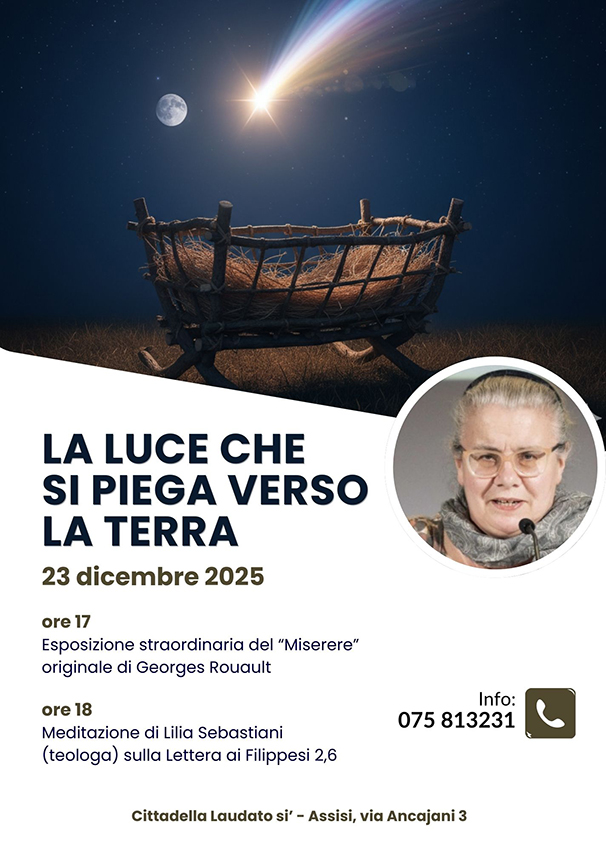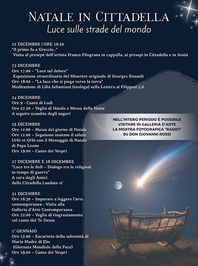 Assisi, 12/12/2025 – La Pro Civitate Christiana presenta anche quest’anno un ricco calendario di appuntamenti dedicati al tempo di Natale, che animerà la Cittadella Laudato si’ di Assisi dal 22 dicembre 2025 al 1° gennaio 2026. Un percorso di meditazioni, incontri culturali, arte e dialogo interreligioso, pensato per offrire occasioni di riflessione e condivisione in un periodo segnato da conflitti e incertezze globali.