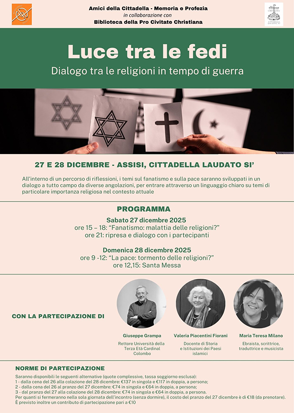 Uno dei momenti centrali del programma è il percorso di riflessione “Luce tra le fedi – Dialogo tra le religioni in tempo di guerra”, promosso dagli Amici della Cittadella – Memoria e Profezia in collaborazione con la Biblioteca della Pro Civitate Christiana.