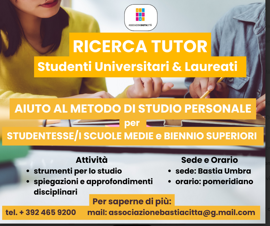 L’ Associazione Bastia Città, dal prossimo 12 gennaio, attiverà per le studentesse e gli studenti delle scuole medie e del biennio delle superiori uno sportello di aiuto al metodo di studio, strumento pedagogico fondamentale per affrontare autonomamente l’esperienza scolastica e renderla occasione ed opportunità di crescita futura e processo attivo e intenzionale.