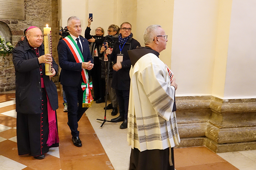 Particolarmente significativo il gesto iniziale della Liturgia della Luce, durante il quale il Vescovo di Assisi-Nocera Umbra-Gualdo Tadino e Foligno, S.E. Mons. Domenico Sorrentino, e il Sindaco di Assisi, Valter Stoppini, hanno varcato insieme la soglia della Basilica portando un cero, successivamente acceso nella