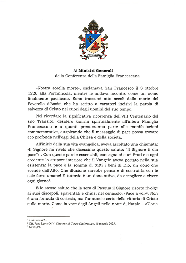 Al termine della celebrazione è stata letta la Lettera che Papa Leone XIV ha voluto indirizzare alla Famiglia francescana e alla Chiesa tutta – insieme ad una Preghiera – per l’apertura del Centenario del Transito di san Francesco, segno della partecipazione del Santo Padre a questo evento di rilevanza universale e della sua vicinanza spirituale al cammino che da Assisi si apre per l’intera comunità ecclesiale.
