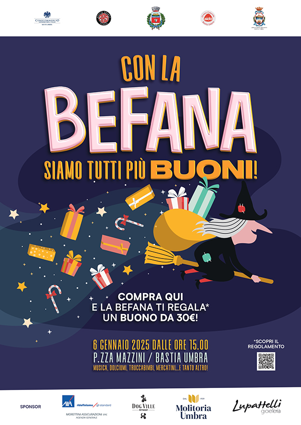 Bastia Umbra, 02/01/2026 – Tutto pronto per il gran finale delle festività a Bastia Umbra. Martedì 6 gennaio, a partire dalle ore 15.30, Piazza Mazzini si vestirà a festa per ospitare la prima edizione di “Con la Befana siamo tutti più buoni!”, l’evento organizzato da Confcommercio Bastia pensato per sostenere il tessuto commerciale locale ed essere l’occasione di animare la città.