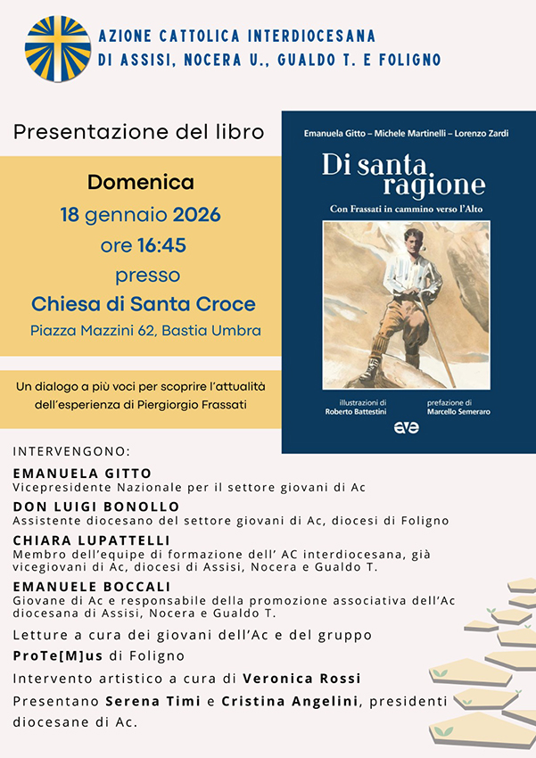 Bastia Umbra, 07/01/2026 – Sarà presentato domenica 18 gennaio 2026 il libro “Di santa ragione” di Emanuela Gitto, don Michele Martinelli e Lorenzo Zardi. Proprio Emanuela Gitto, Vicepresidente Nazionale per il settore giovani di Azione Cattolica, prenderà parte all’incontro, che si terrà presso la chiesa di Santa Croce in Bastia Umbra. Sarà un dialogo a più voci, al quale prenderanno parte don Luigi Bonollo (assistente diocesano del settore giovani di Ac della diocesi di Foligno), Chiara Lupattelli (membro dell’equipe di formazione dell’Azione Cattolica delle diocesi sorelle di Assisi – Nocera Umbra – Gualdo T. e Foligno) ed Emanuele Boccali (giovane di Ac e responsabile della promozione associativa dell’Ac diocesana di Assisi), alla scoperta dell’attualità del messaggio di Piergiorgio Frassati, giovane torinese vissuto cento anni fa e canonizzato da Papa Leone XIV il 7 settembre 2025.