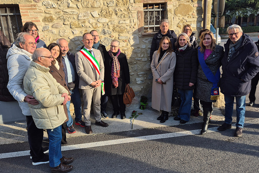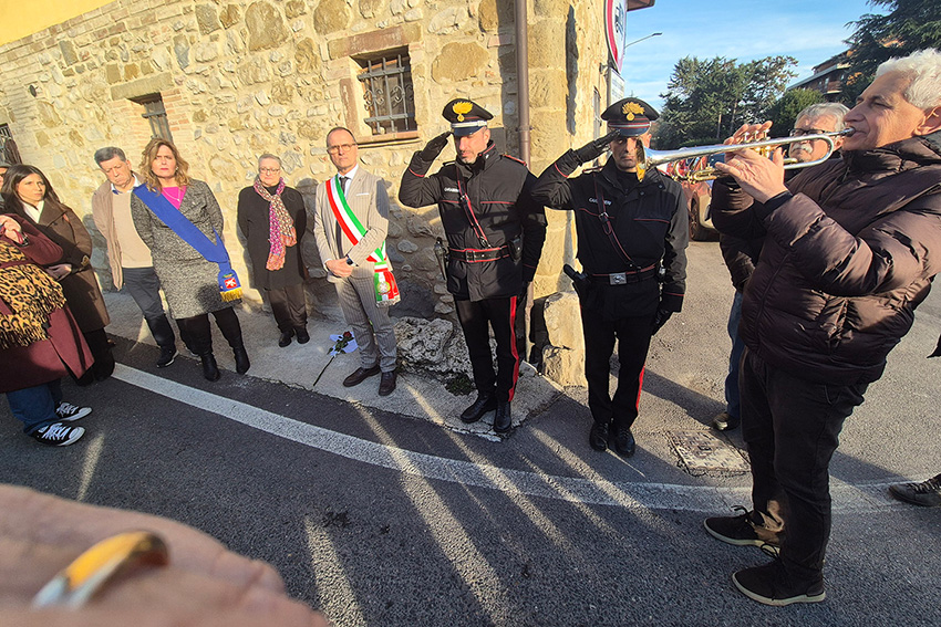 Durante la cerimonia, condotta dallo storico Luigino Ciotti e successivamente dal consigliere comunale Laura Servi, è stato spiegato il significato profondo delle Pietre d’inciampo, un’iniziativa unica nel suo genere. Con una rosa deposta sopra, tra grande emozione, è stata scoperta la targa in memoria del militare. Dopo le conclusioni del sindaco Erigo Pecci, è seguito un momento di raccoglimento, accompagnato dal Silenzio, eseguito insieme ai Carabinieri di Bastia Umbra. La commemorazione è poi proseguita nel centro di Bastia, dove sono state disvelate le altre pietre dedicate a Pietro Mancinelli, Carlo Monacchia, Lanfranco Serlupini e Giorgio Degli Esposti.