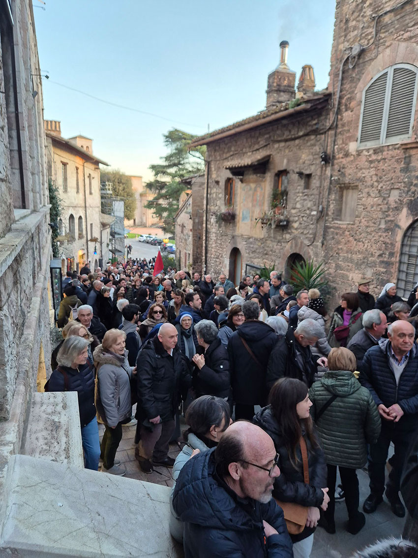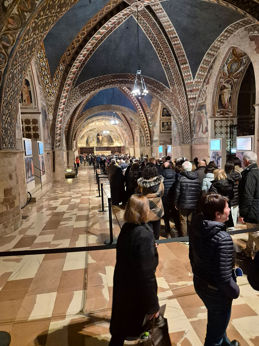 Da San Rufino siamo scesi a piedi verso la Basilica Inferiore. Un percorso in discesa, semplice solo in apparenza, ma pieno di insidie per chi non ha buoni freni ai piedi. Lungo il tragitto la folla aumentava. Già nei pressi della abbazia di San Pietro la fila era interminabile. Lungo il percorso vi erano organizzati blocchi per regolare l’accesso, infine, nel piazzale antistante la Basilica vi era montato un grande tendone dove tutti venivano controllati con i metal detector. Volontari, forze dell’ordine e frati insieme per una macchina organizzativa efficace e composta. Nella sola prima giornata sono entrate circa 18.000 persone, con una media di 1.500 ogni ora. Numeri importanti, eppure l’atmosfera era di rispetto, di pazienza, di collaborazione. Complice una temperatura quasi primaverile, ma soprattutto un clima di raccoglimento autentico.