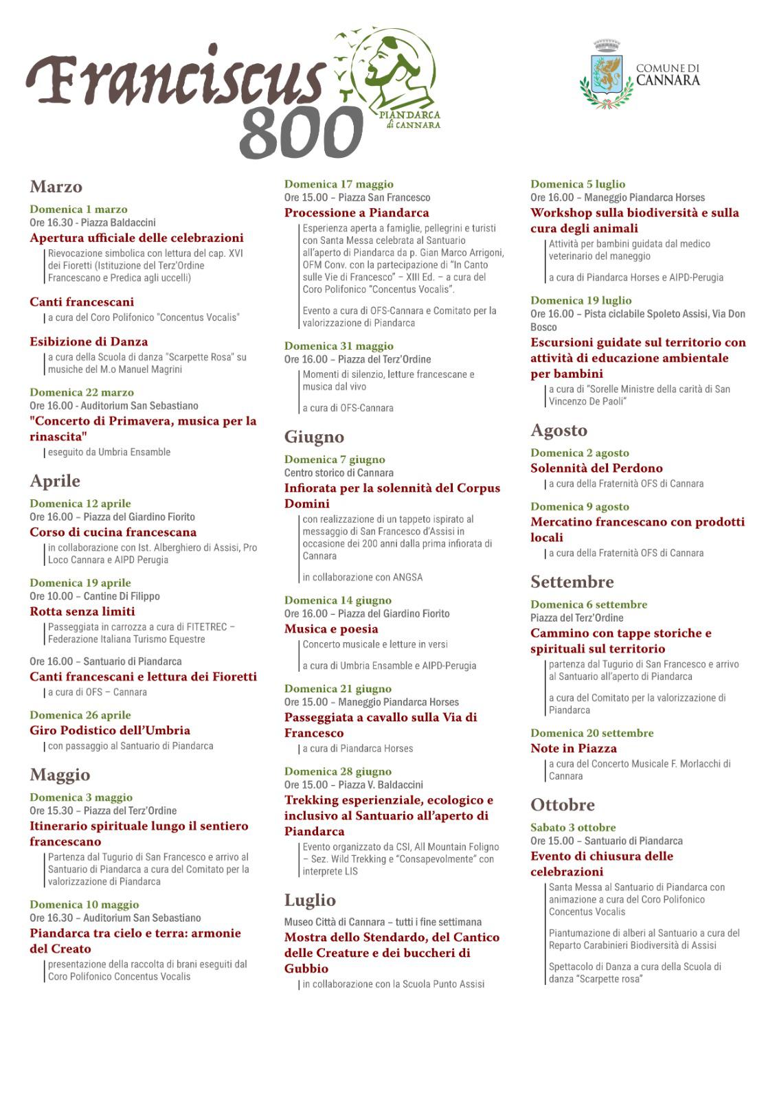 Entusiasta l’Assessore al Turismo, Lucia Paoli, che ha voluto sottolineare l’attrattività di un programma che spazia dalla musica al trekking: “Abbiamo lavorato intensamente per offrire un calendario che parli a pubblici diversi: dai pellegrini ai turisti, dalle famiglie ai giovani. ‘Franciscus 800’ non è solo un omaggio al Poverello d’Assisi, ma una vetrina per la bellezza e l’accoglienza della nostra Cannara. Vogliamo che ogni visitatore si senta parte della nostra storia.”