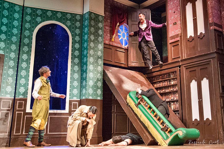Il racconto prende forma tra una scenografia che implode a poco a poco su sé stessa e attori strampalati che, goffamente, tentano di parare i colpi degli svariati tragicomici inconvenienti che si intromettono tra loro ed il