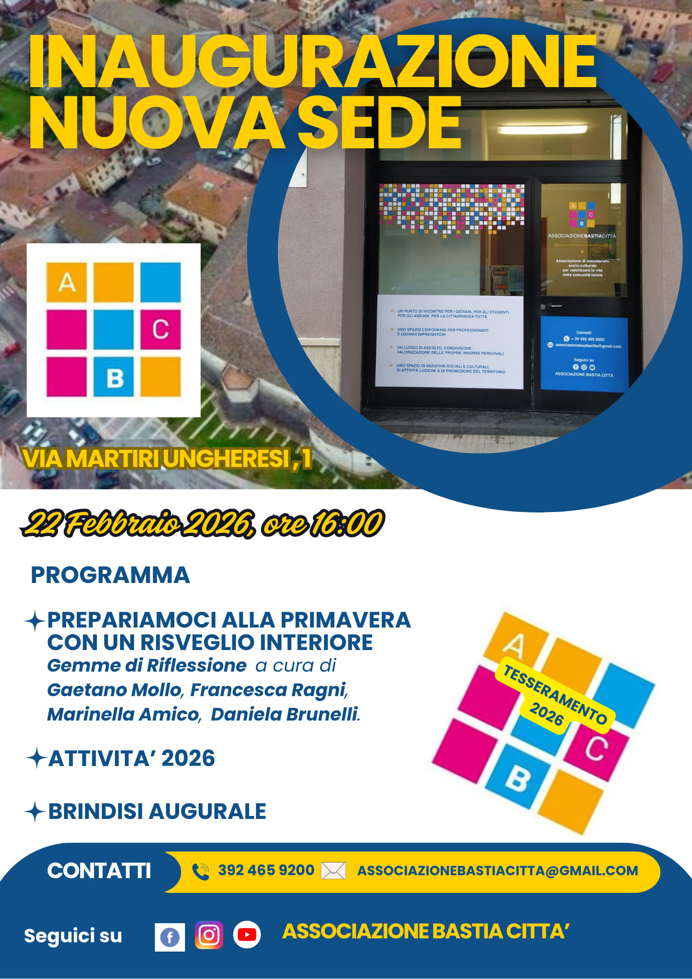 L’Associazione Bastia Città è lieta di invitare la cittadinanza, le autorità e la stampa all’inaugurazione ufficiale della nuova sede in Via Martiri Ungheresi 1, che si terrà domenica 22 febbraio 2026 alle ore 16:00.