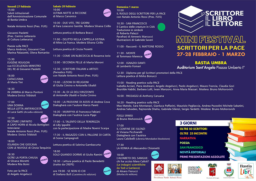 Bastia Umbra, 20/02/2026 – Dal 27 febbraio al 1° marzo l’Auditorium Sant’Angelo di Bastia Umbra ospiterà il Mini Festival “Scrittori per la Pace”, tappa del format nazionale “Lo Scrittore, il Libro, il Lettore”, il primo festival letterario che pone al centro la figura dello scrittore, promosso dalla Federazione Unitaria Italiana Scrittori e Federintermedia, in collaborazione con l’Associazione Centro Europeo di Cultura Letteraria.