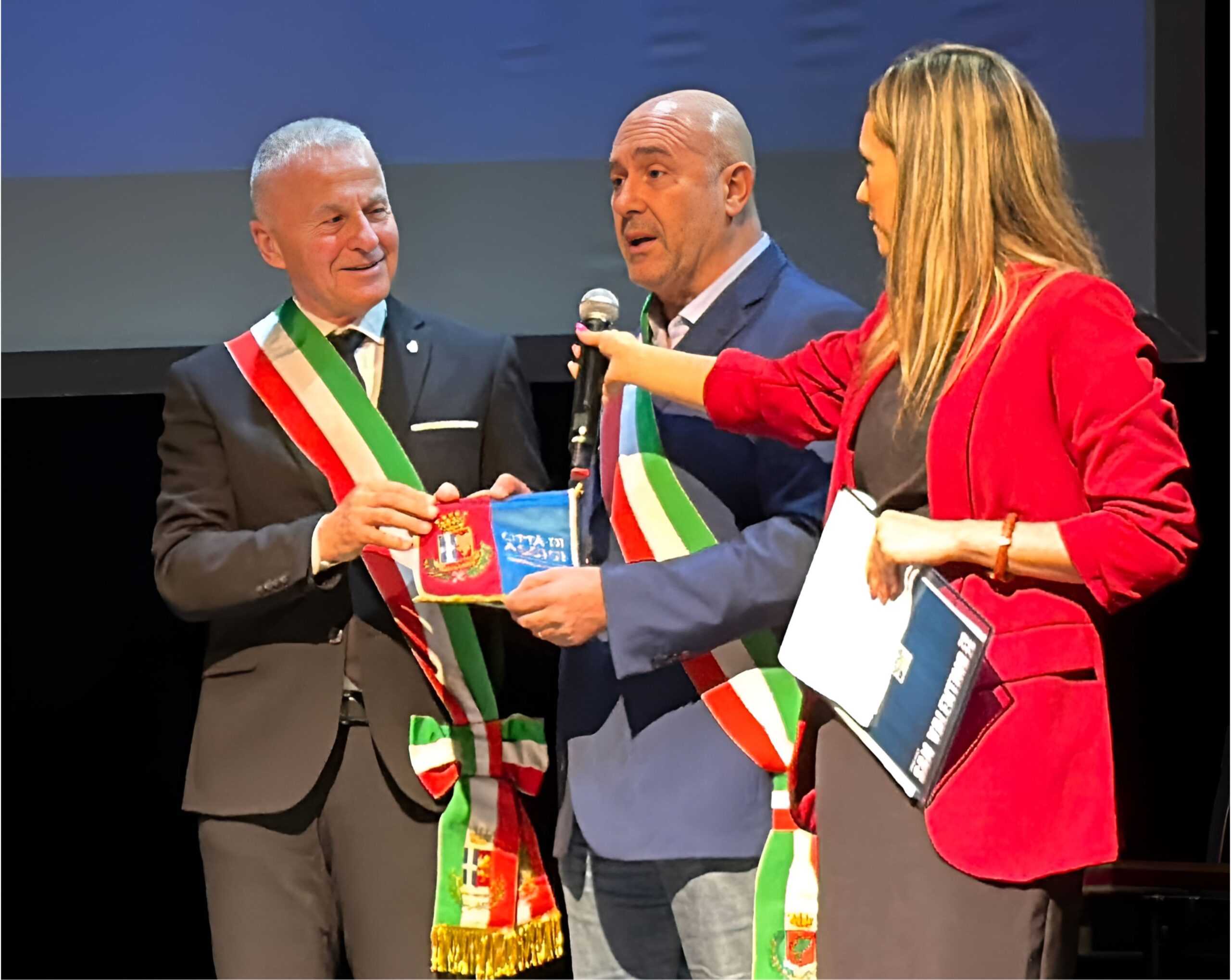 Uno dei momenti più sentiti della serata è stato la consegna del Gagliardetto ufficiale della Città di Assisi, che il Sindaco Valter Stoppini ha voluto donare al Sindaco di Terni Stefano Bandecchi e al Presidente Sauro Pellerucci.