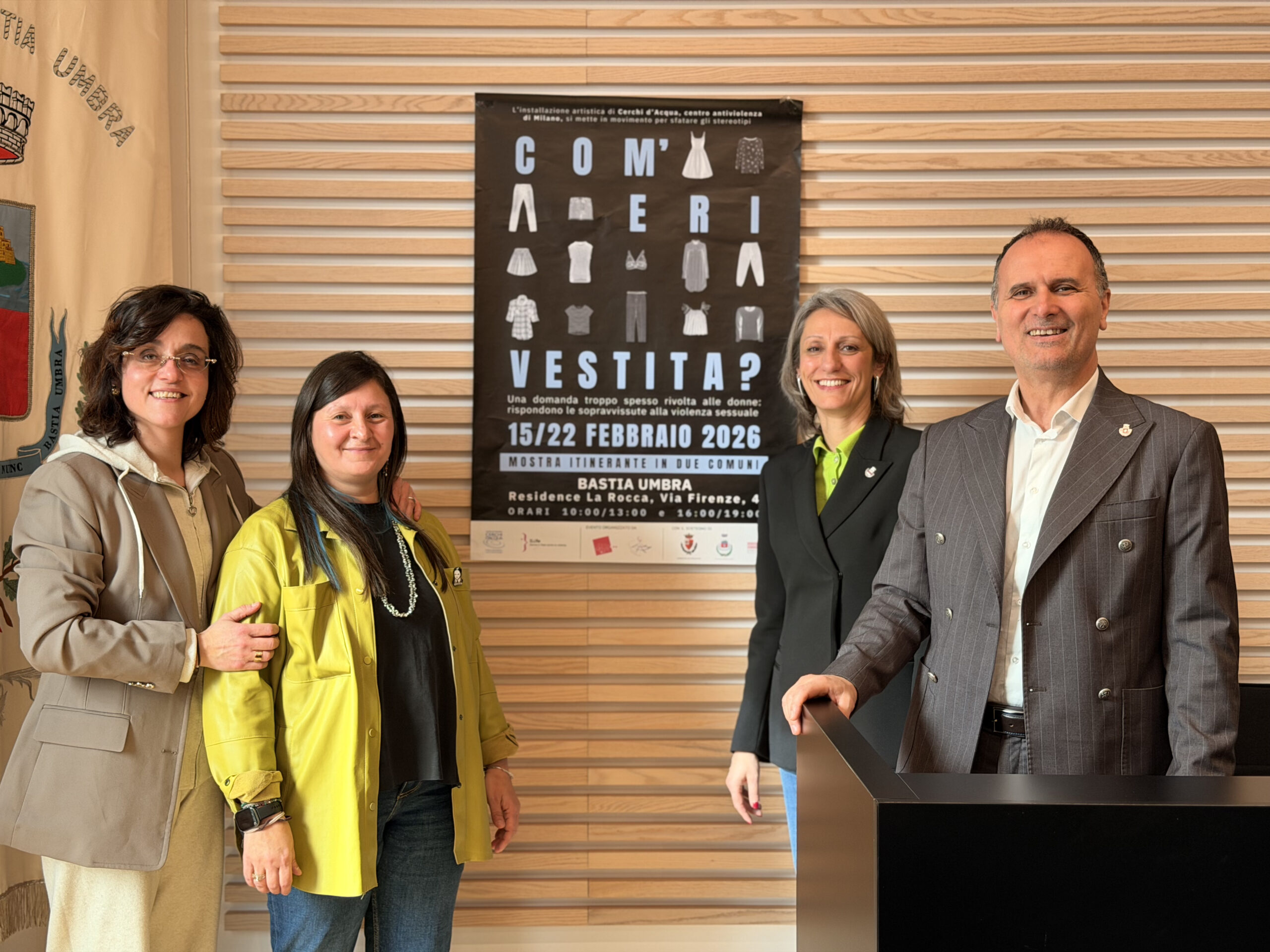 Questa mattina, sabato 7 febbraio 2026, presso la Sala Consiliare del Comune di Bastia Umbra, si è svolta la Conferenza Stampa di presentazione della mostra “Com’eri vestita?”, un’iniziativa di forte impatto dedicata alla sensibilizzazione contro la violenza sessuale e la cultura della colpevolizzazione della vittima.