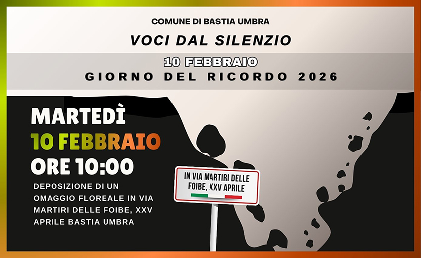 Martedì 10 febbraio, alle ore 10:00, si terrà la deposizione di un omaggio floreale in Via Martiri delle Foibe – XXV Aprile, a Bastia Umbra, come segno di rispetto e commemorazione.