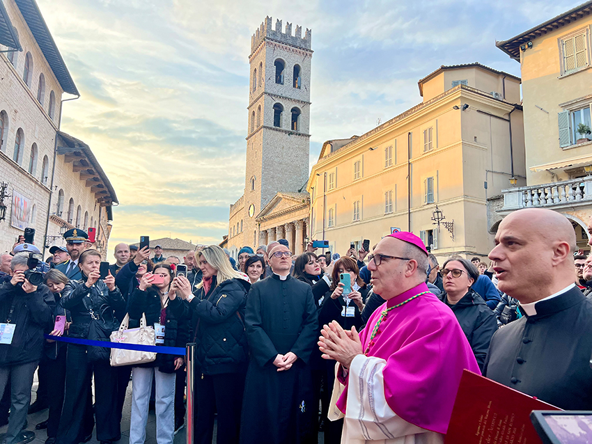 L’evento in piazza del Comune, proprio davanti al Palazzo Comunale, è stato di fatto il primo incontro del nuovo vescovo con i cittadini di Assisi, presenti numerosi. Diverse le autorità civili, religiose e militari, fra le quali presidente della Regione Umbria, Stefania Proietti, il presidente della Provincia di Perugia Massimiliano Presciutti, il prefetto di Perugia Francesco Zito, il questore di Perugia Dario Sallustio, la presidente del Consiglio comunale di Assisi Annalisa Rossi, rappresentanti della Giunta comunale, consiglieri comunali, sindaci e amministratori del territorio e di città legate a monsignor Accrocca, come Cori, Pietrelcina e Benevento.