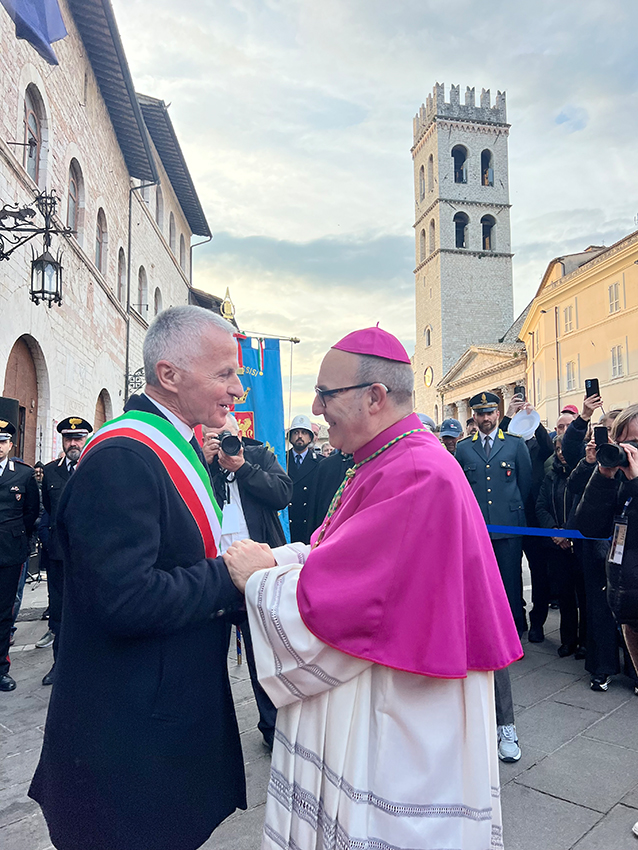 “Assisi – ha detto il primo cittadino, parlando a nome dell’intera Amministrazione comunale – è una grande casa, con le porte sempre aperte. Il mio compito è quello di far funzionare bene la città, ma c’è bisogno di un concittadino e di un amico come lei, che si prenda cura del cuore delle persone. Insieme, possiamo fare in modo che nessuno si senta solo. Non sarà sempre facile, ma se camminiamo vicini tutto sarà possibile: Assisi è magnifica non solo nei suoi monumenti, ma soprattutto nella sua comunità. Benvenuto a casa, le auguriamo un cammino luminoso”. Stoppini ha ricordato anche il lavoro svolto da monsignor Domenico