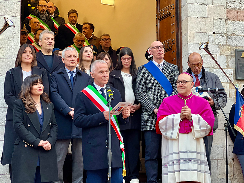 Assisi, 25/03/2026 – “Con grande gioia, le diamo il benvenuto ad Assisi. Una città aperta al mondo, dove società civile e comunità religiosa convivono per custodire e promuovere il messaggio di San Francesco. Lei ha seguito il Poverello ben prima di diventare nostro vescovo, come studioso e biografo ha dedicato anni a raccontare la sfida che ha lanciato all’intera società e oggi siamo onorati di accoglierla qui”. Il sindaco di Assisi Valter Stoppini ha salutato così monsignor Felice Accrocca, nuovo presule della diocesi di Assisi-Nocera Umbra-Gualdo Tadino e Foligno, che si è insediato oggi pomeriggio salutando le autorità civili e militari in piazza del Comune, raggiunta a piedi da piazza Santa Chiara, accolto dal Gonfalone della città, dal suono della Campana delle Laudi della torre civica e delle Chiarine comunali.