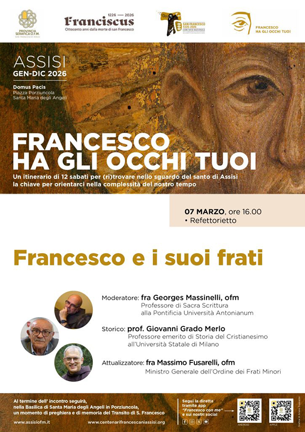 Sabato 7 marzo — presso il Refettorietto della Basilica di Santa Maria degli Angeli, a pochi passi dalla Porziuncola — si terrà il terzo evento, dedicato al tema “Francesco e i suoi frati”, che vedrà la partecipazione di: