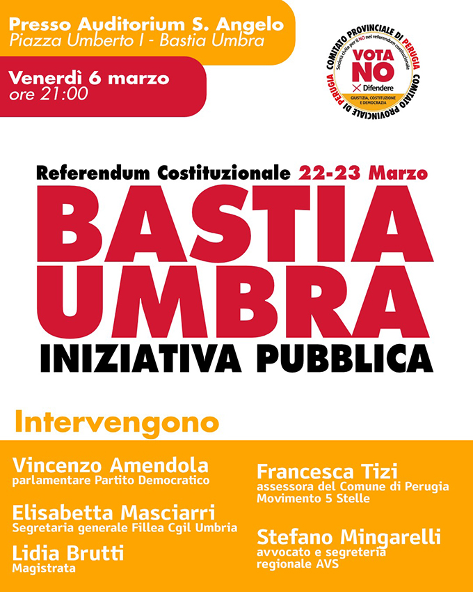 Bastia Umbra, 03/03/2026 – Il Partito Democratico, il Movimento 5 Stelle, Alleanza Verdi Sinistra, le liste civiche e la CGIL informano la cittadinanza di aver promosso e organizzato, in un percorso condiviso di rete territoriale e collaborazione politica, l’iniziativa pubblica dal titolo “Bastia Umbra – Referendum Costituzionale”, che si terrà venerdì 6 marzo alle ore 21.00 presso l’Auditorium Sant’Angelo di Bastia Umbra.