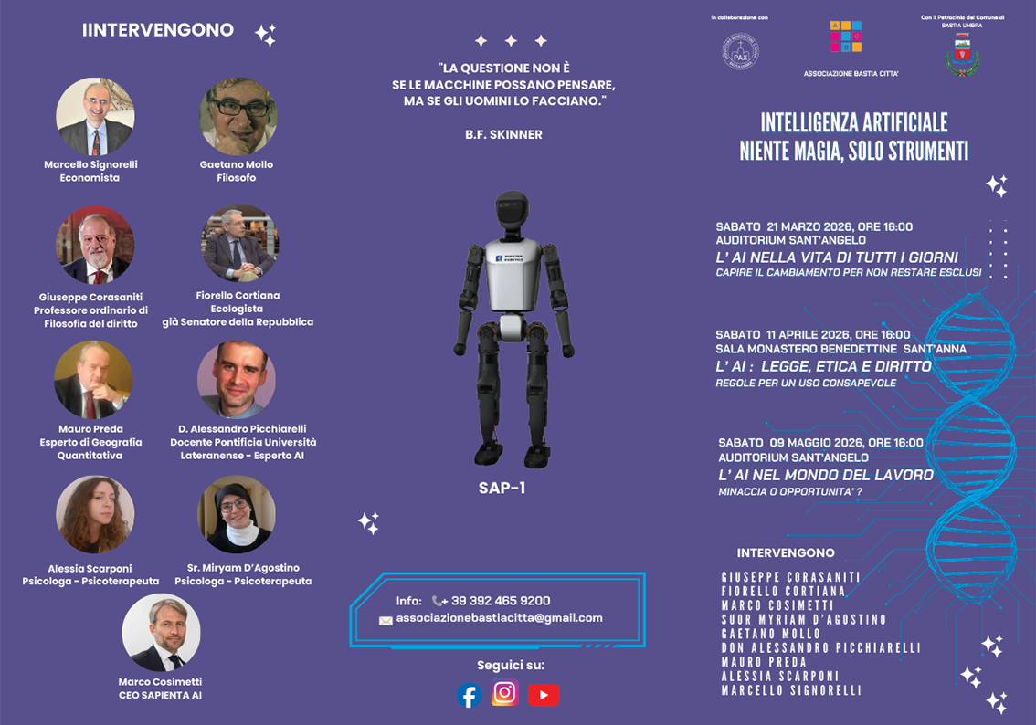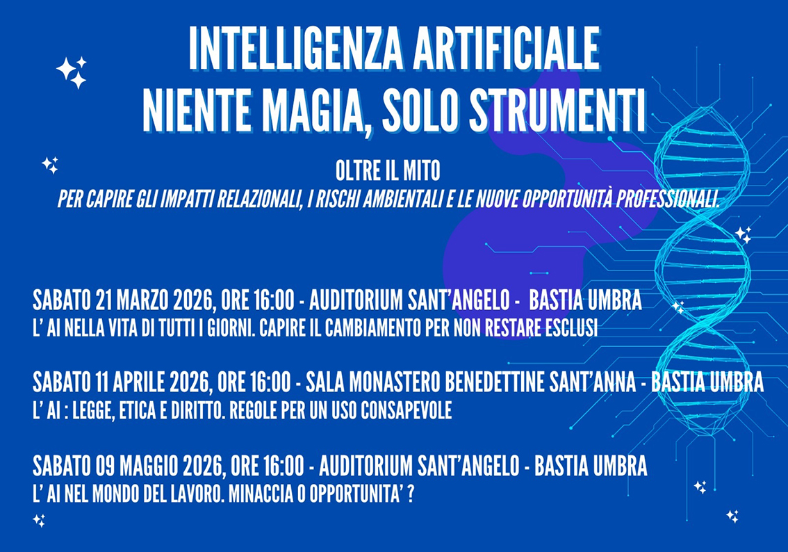 Bastia Umbra, 09/03/2026 – L’Associazione Bastia Città è onorata di presentare un ciclo di conferenze sull’ Intelligenza Artificiale dal titolo: “Intelligenza Artificiale: Niente Magia, Solo Strumenti”, in programma tra marzo e maggio 2026, in collaborazione con il Monastero Benedettino di Sant’Anna e con il patrocinio del Comune di Bastia Umbra.