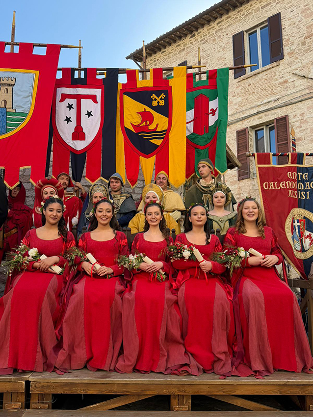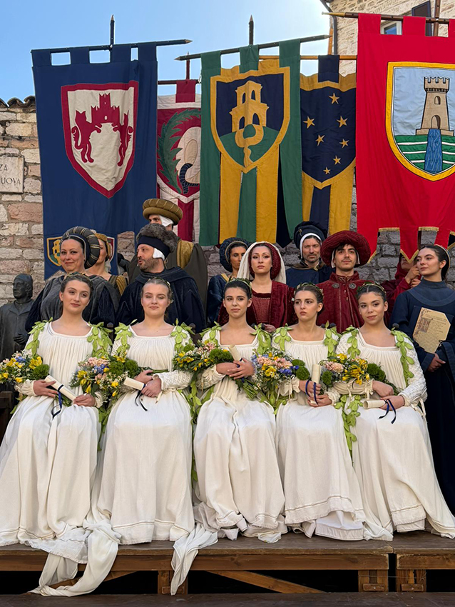 Allietate dall’omaggio canoro dei Cantori di Assisi, e dal saluto del sindaco della Città di Assisi Valter Stoppini e del presidente dell’Ente Simone Menichelli, le Parti hanno presentato Monna Sofia Balducci, Monna Caterina Principale, Monna Isabella Ranocchia, Monna Agnese Salari e Monna Camilla Santarelli (Sotto) e Monna Margherita Crivelli, Monna Marta Gubbiotti, Monna Anna Menichelli. Monna Eloisa Parodi e Monna Sara Tutarini (Sopra). Nella giornata di giovedì, dopo le sfide tra gli “sportivi” di Magnifica e Nobilissima, il balestriere con il punteggio più alto della Parte che ha la meglio nelle tre gare precedenti, incorona la sua Madonna. La vittoria in questa gara non influisce nell’assegnazione del Palio, ma la Parte che vince Madonna Primavera ha la possibilità di mettere per prima in scena le rievocazioni di vita medioevale nel prossimo Calendimaggio e “impressionare” così per prima i giurati – quest’anno il regista Ascanio Celestini, il direttore di coro Maurizio Sacquegna e il professor Umberto Longo – con le suggestive rievocazioni di vita medioevale in notturna.