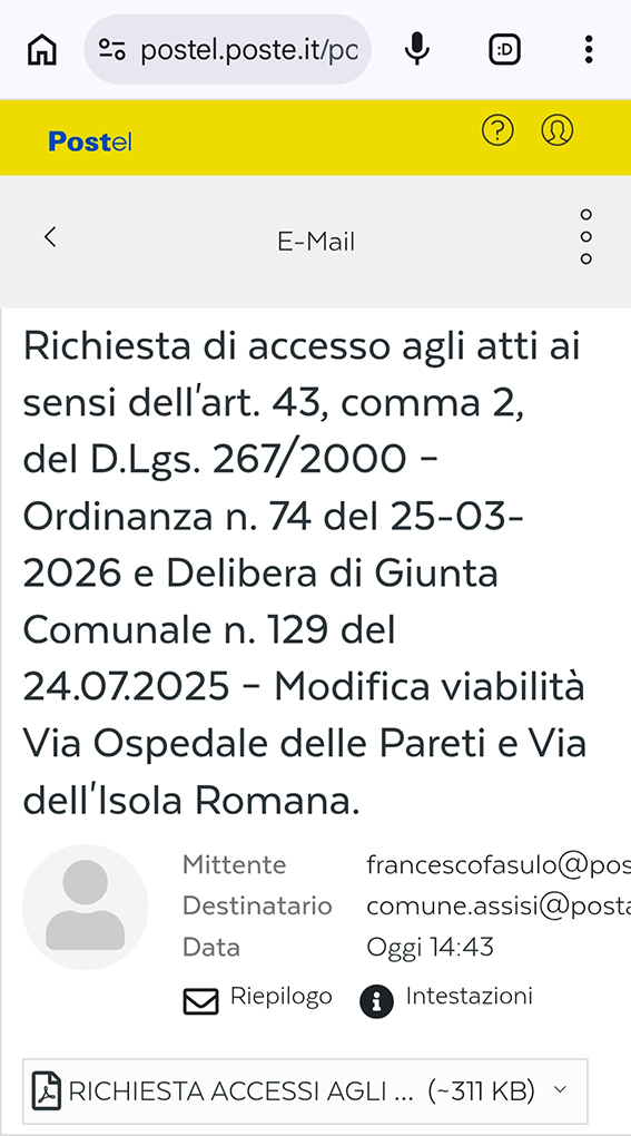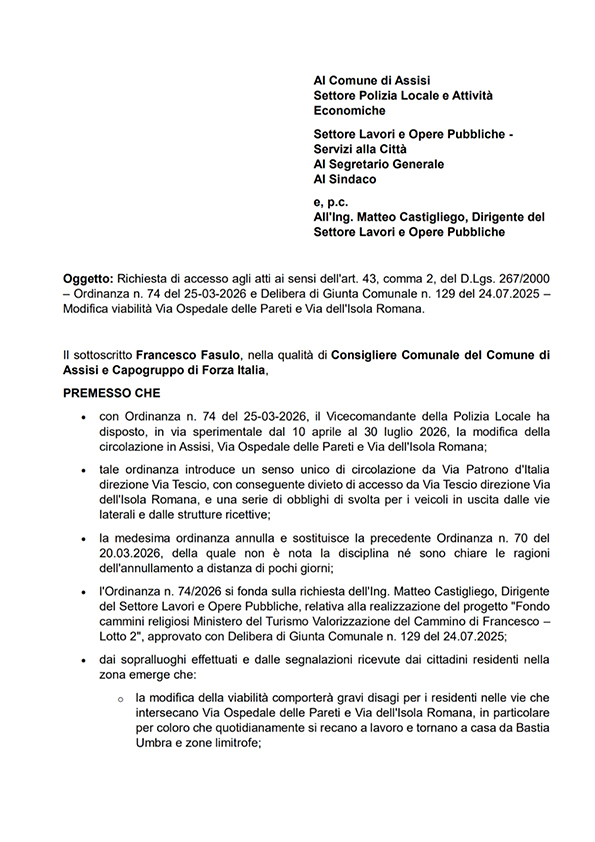 Assisi, 10/04/2026 – Il Capogruppo di Forza Italia al Comune di Assisi, Francesco Fasulo, ha depositato oggi una formale richiesta di accesso agli atti per fare piena luce sulla controversa modifica della viabilità in Via Ospedale delle Pareti e Via dell’Isola Romana, entrata in vigore proprio in queste ore con l’Ordinanza n. 74 del 25 marzo scorso.