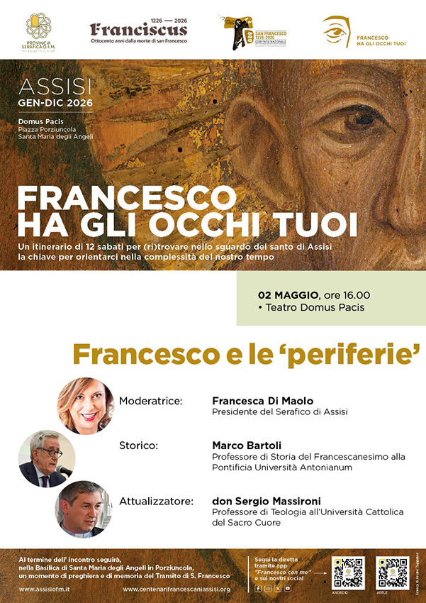 Sabato 2 maggio, presso il Teatro della Domus Pacis di Santa Maria degli Angeli (Assisi), a pochi passi dalla Porziuncola, si terrà il quinto evento, dedicato al tema “Francesco e le periferie”, un argomento di forte rilevanza umana e spirituale, capace di interrogare profondamente anche il nostro presente.