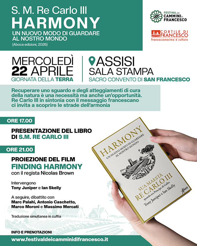 Il pomeriggio, all’interno del festival dei cammini di Francesco, presso la Sala Stampa del Sacro Convento, alle ore 17 ci sarà la presentazione di Harmony, il libro sull’ambiente scritto da Re Carlo III – quando era ancora Principe di Galles – nella versione in lingua italiana. L’incontro vedrà la partecipazione dei coautori del libro, Ian Skelly e Tony Juniper, seguita da un dibattito che coinvolgerà il direttore generale di C.B.A. (Circular Bioeconomy Alliance), Marc Palahi, il direttore del Centro Laudato Si’ di Assisi, Antonio Caschetto, fra Marco Moroni, OFMConv, Custode del Sacro Convento di San Francesco in Assisi, e Massimo Mercati, Amministratore delegato di Aboca. L’incontro sarà preceduto dai saluti istituzionali di Christopher Trott CVO, Ambasciatore britannico presso la Santa Sede e di altri ospiti istituzionali.