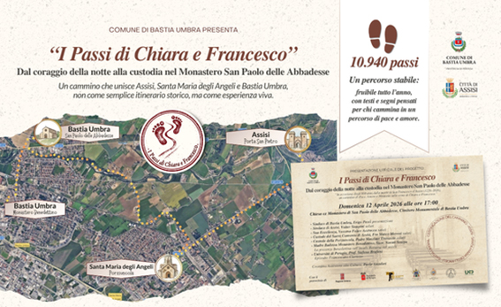 Bastia Umbra, 03/04/2026 – Domenica 12 aprile 2026, alle ore 17:00, presso la Chiesa dell’ex Monastero di San Paolo delle Abbadesse, nel Cimitero Monumentale di Bastia Umbra, verrà presentato il progetto “I Passi di Chiara e Francesco”, un itinerario culturale, spirituale e naturalistico di grande rilievo che unisce i territori di Assisi e Bastia Umbra.