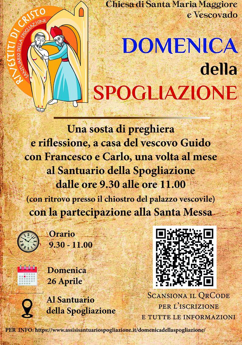 Una domenica al mese poi, che ad aprile sarà il 26, è inoltre, possibile partecipare alla Domenica della Spogliazione, una sosta di riflessione nell’antico vescovado per condividere aspetti dell’esperienza che San Francesco ha vissuto in questo luogo. L’iniziativa, aperta a un massimo di 60 persone, dalle 9,30 alle 11, permetterà anche di approfondire la figura di San Carlo, con la possibilità di partecipare alla fine alla solenne celebrazione eucaristica nella chiesa di Santa Maria Maggiore. Per i gruppi, è invece possibile organizzare la Domenica della Spogliazione in una domenica diversa da quella in cui è in programma l’appuntamento scrivendo a: domenicadellaspogliazione@gmail.com per concordare la data e gli orari. “Si tratta di due nuove iniziative – conclude Rosati – che puntano ad ampliare l’offerta del Santuario, cercando di andare incontro alle esigenze dei pellegrini e guidandoli alla scoperta dei luoghi e di due santi come Francesco e Carlo, che qui al Santuario della Spogliazione, sono un team perfetto di testimonianza ed evangelizzazione”.